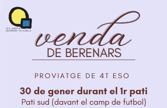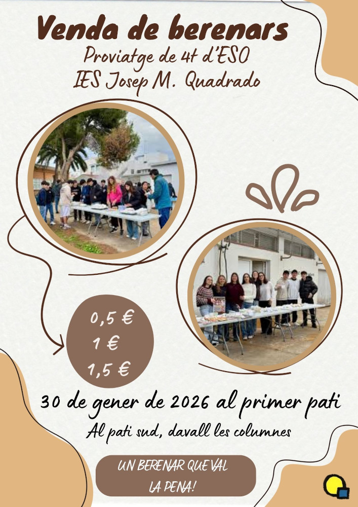 Aquest divendres, 30 de gener, al primer pati, els alumnes de 4t d’ESO organitzen un berenar per recollir euros per al viatge d’estudis a Oliola. Col·labora i gaudeix d’un bon berenar!
