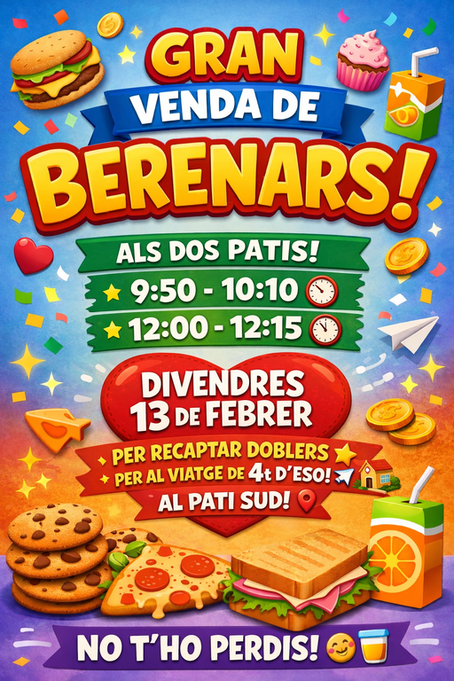 Aquest divendres, 13 de febrer, als dos patis, els alumnes de 4t d’ESO organitzen un berenar per recollir euros per al viatge d’estudis a Oliola. Col·labora i gaudeix d’un bon berenar!