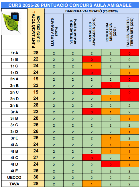 Aquestes són les puntuacions del concurs Aula Amigable a l’inici del mes d’abril. Aquest programa té com a objectiu fomentar el respecte, la convivència i la cura dels espais comuns del centre, tot implicant directament l’alumnat en el bon funcionament del dia a dia. Durant aquest mes s’han valorat, com és habitual, diferents aspectes relacionats amb […]