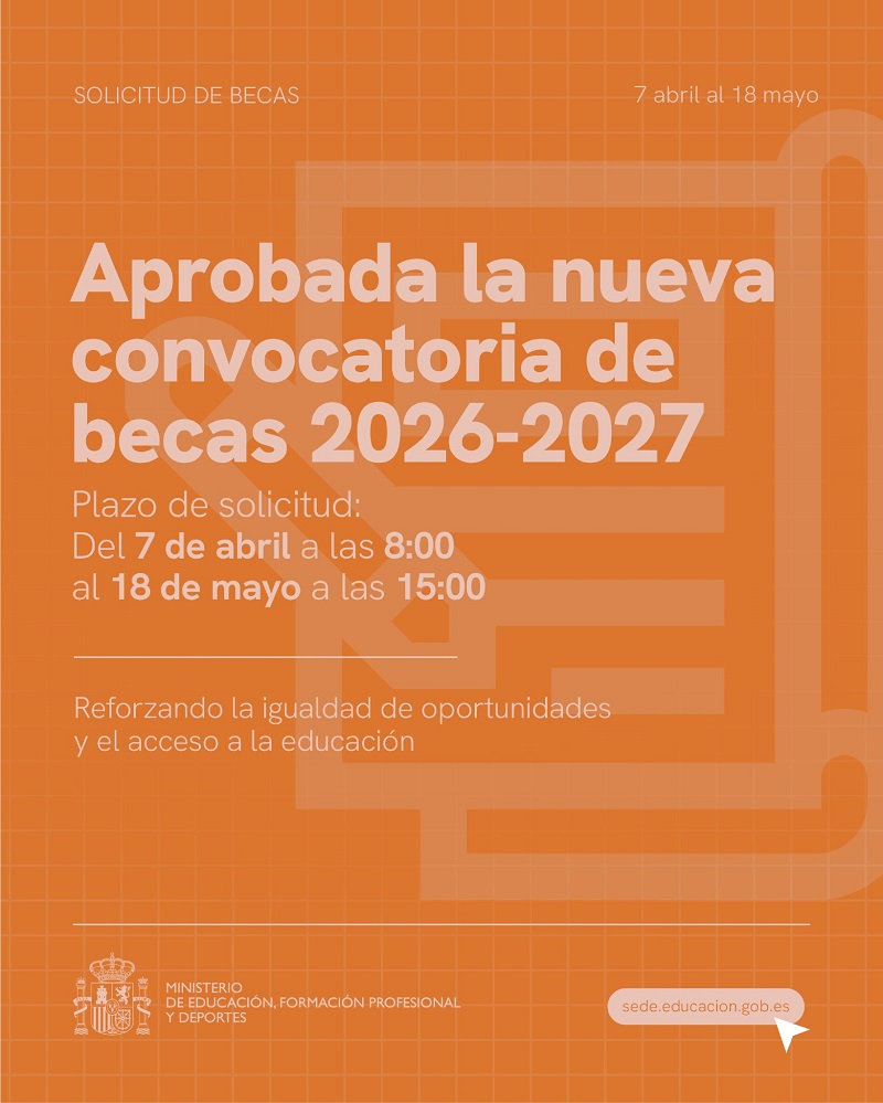 El Ministeri d’Educació i Formació Professional ha publicat la convocatòria de beques per a estudis postobligatoris no universitaris per al curs 2026/2027. El termini per presentar les sol·licituds, a través de la seu electrònica del Ministeri, és del 7 d’abril de 2026 a les 8:00 hores fins al 18 de maig de 2026 a les […]