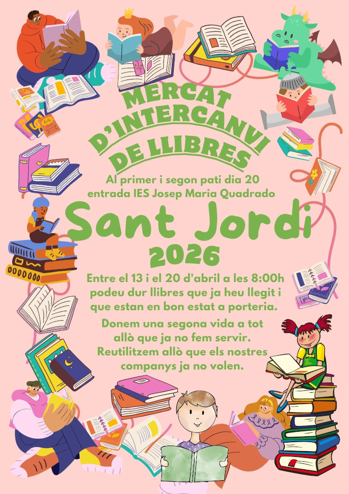 Entre el 13 i el 20 d’abril podeu dur llibres que ja heu llegit i que estan en bon estat a la porteria del centre. D’aquesta manera, donarem una segona vida a tot allò que ja no fem servir i reutilitzarem allò que els nostres companys ja no volen.