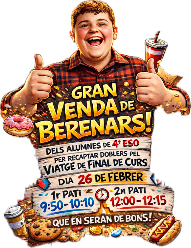 Dijous dia 26 de febrer, els alumnes de 4t d’ESO vendran berenars als dos patis per recaptar doblers pel viatge de final de curs. Animau-vos!!