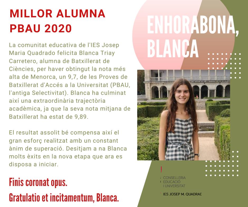 Blanca triay carretero obté la millor nota PBAU de Menorca 2020Per Oficines / 28/07/2020 / 2019-20 Batxillerat