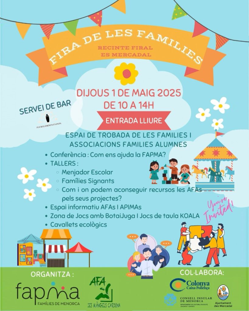 La Fira de les Famílies 2025 és una iniciativa organitzada per la FAPMA (Famílies de Menorca) i l’AFA IES Maria Àngels Cardona, amb la col·laboració del Consell Insular de Menorca i l’Ajuntament des Mercadal.