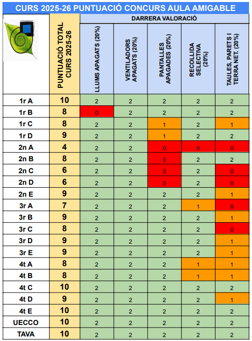 En la puntuació del mes de gener, destaquen especialment aquells grups que han assolit la puntuació màxima, demostrant una actitud constant i responsable envers l’aula i els espais compartits. També hi ha grups que, tot i no arribar al màxim, mostren una bona dinàmica i marge de millora en alguns aspectes concrets.