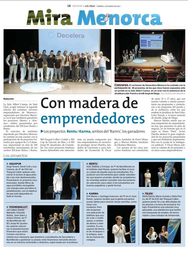 Jan López, Daniel Marquès, Gonzalo Núñez, Joan Sbert i Antoni Vinent de 1r de batxillerat, van participar en el certamen de Joves emprenedors de Menorca amb el projecte Youngwallet amb el qual volen solucionar la desinformació financera existent, per aquest motiu, van crear una eina molt necessària que mostrarà a estudiants de secundària i batxillerat a gestionar la seva pròpia ‘vida financera’ prenent decisions en un entorn controlat i dinàmic, supervisat pel professorat.
