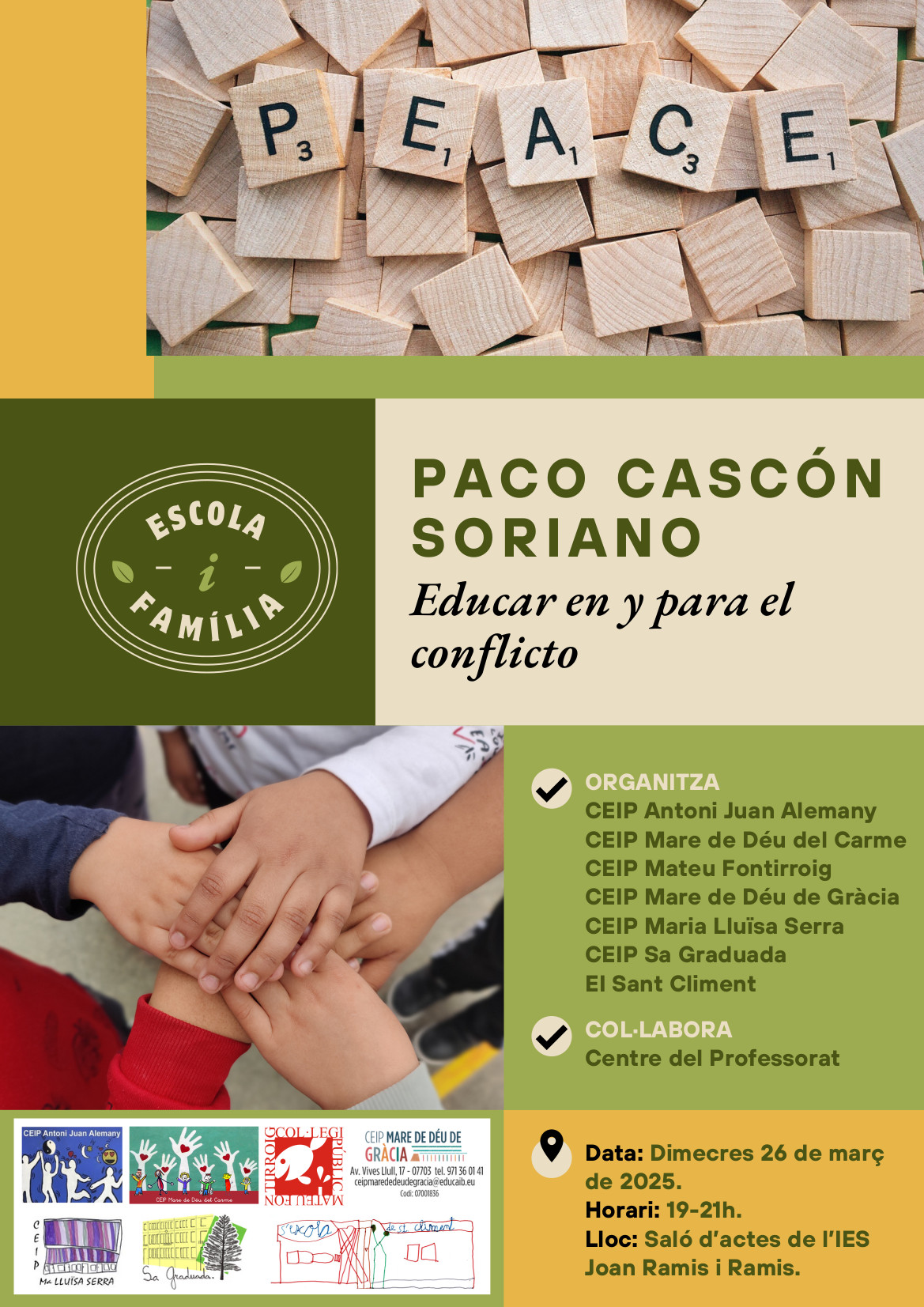 Arran del curs de formació amb el ponent Paco Cascón, organitzat pel CEP i dut a terme els passats dies 10 i 11 de març, els centres d’educació infantil i primària CEIP Mateu Fontirroig, CEIP Sa Graduada, CEIP Maria Lluïsa Serra, CEIP Antoni Juan Alemany, CEIP Mare de Déu del Carme, CEIP Mare de Déu de Gràcia i l’EI Sant Climent organitzen una xerrada per a famílies amb Paco Cascón sota el títol “Educar en y para el conflicto”.