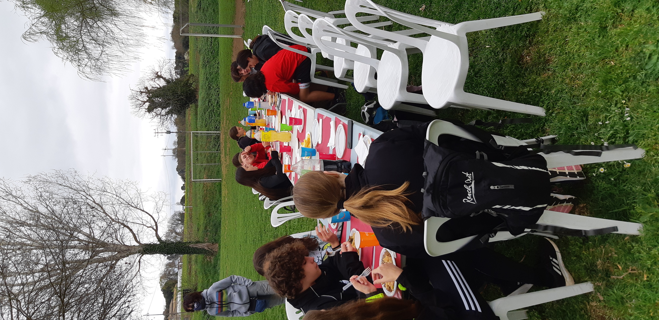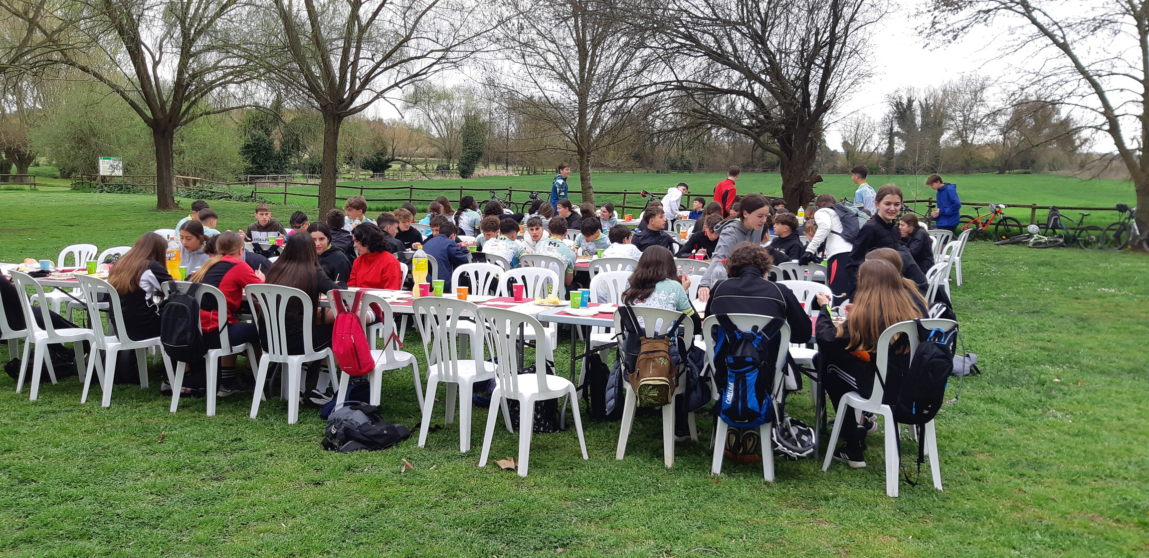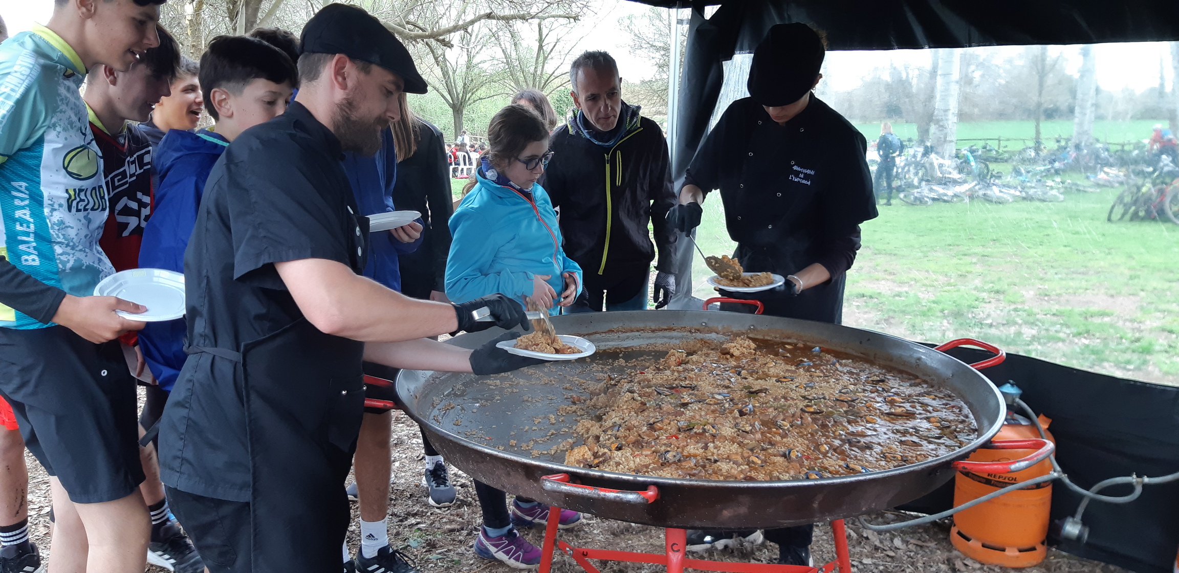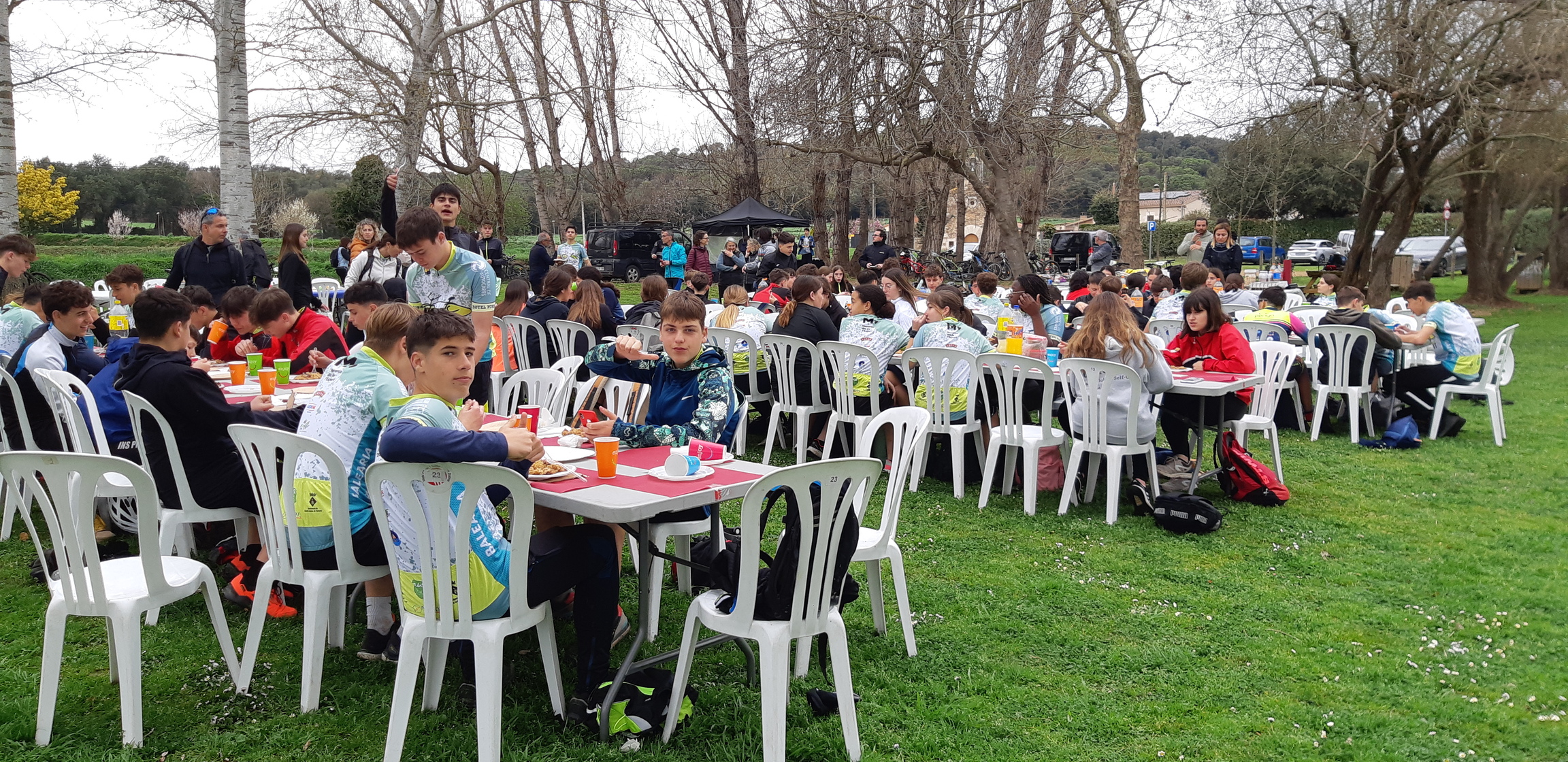 A les 14:30h hem arribat a la zona verda on les famílies gironines han posat la paella i nosaltres la gana! Entremig, repartiment de dorsals per a les velos i unes taules ben polides per continuar agermanant-nos.